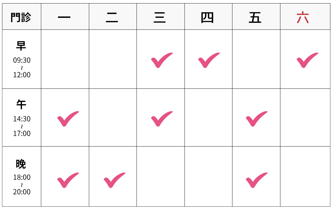 備註:週一、週二、週五20:00前就診掛號。掛號與線雕特約門診,請於看診時間來電預約。
